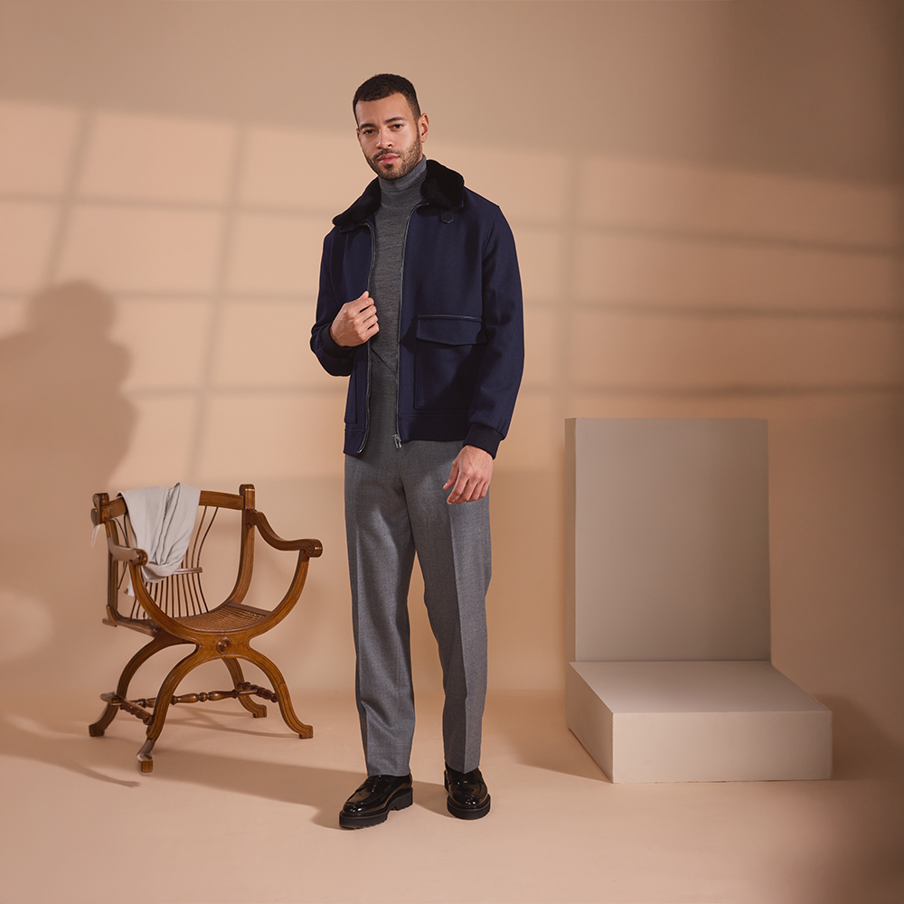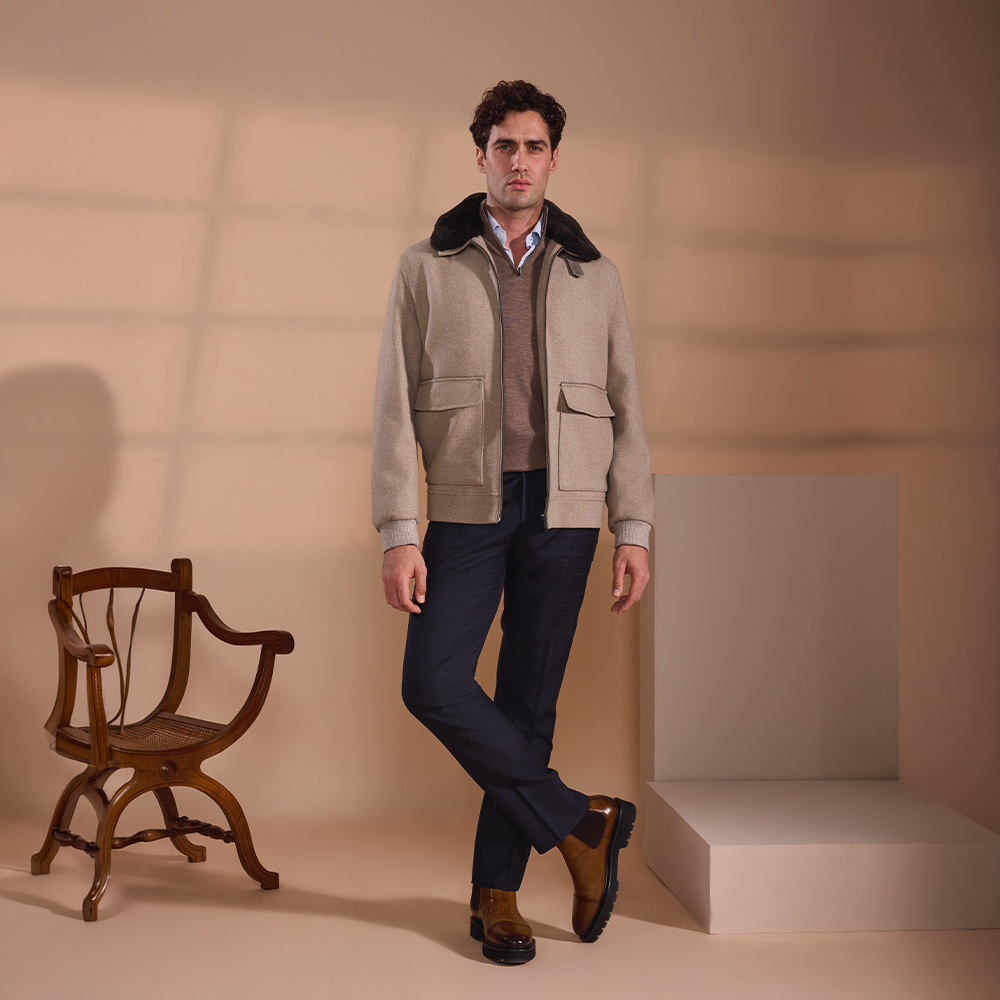 A refined beige wool jacket with a sleek silhouette, featuring a plush dark shearling collar for a sophisticated yet cozy look.