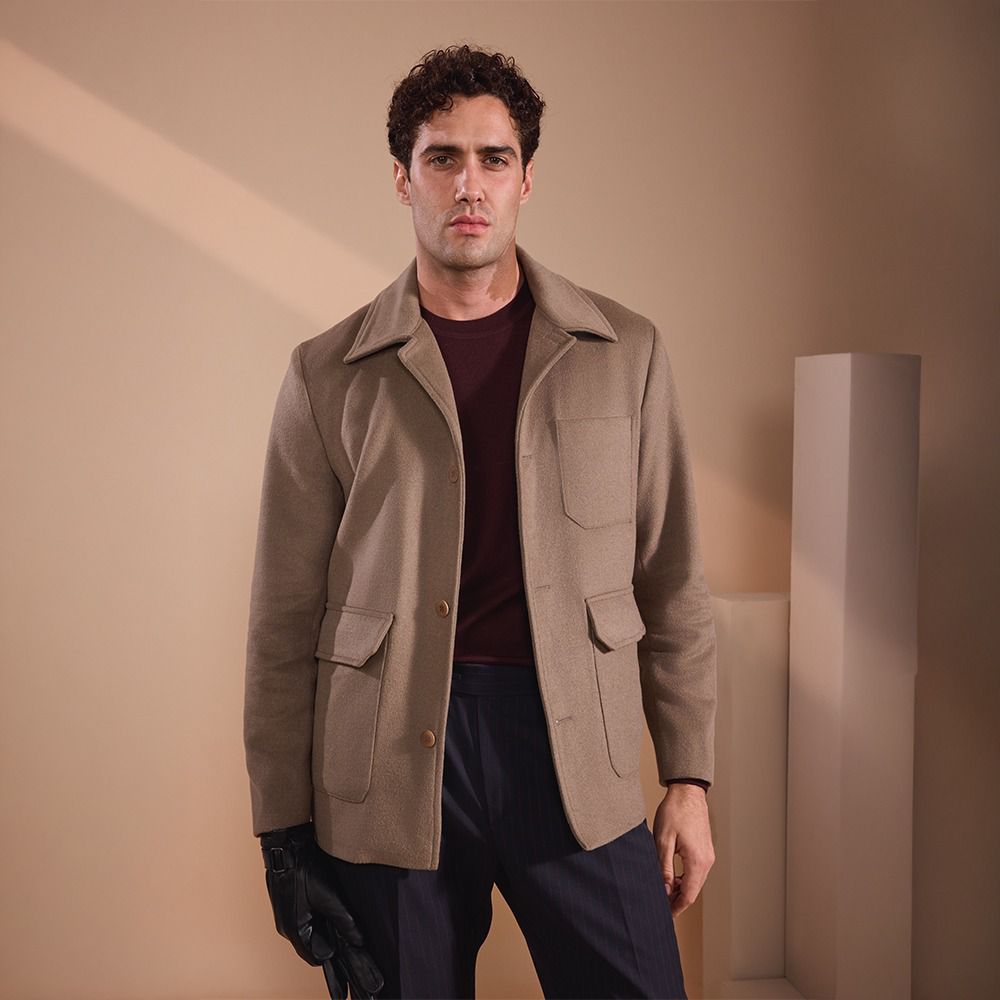 A timeless beige jacket with structured tailoring and utility pockets, delivering effortless sophistication and refined style.