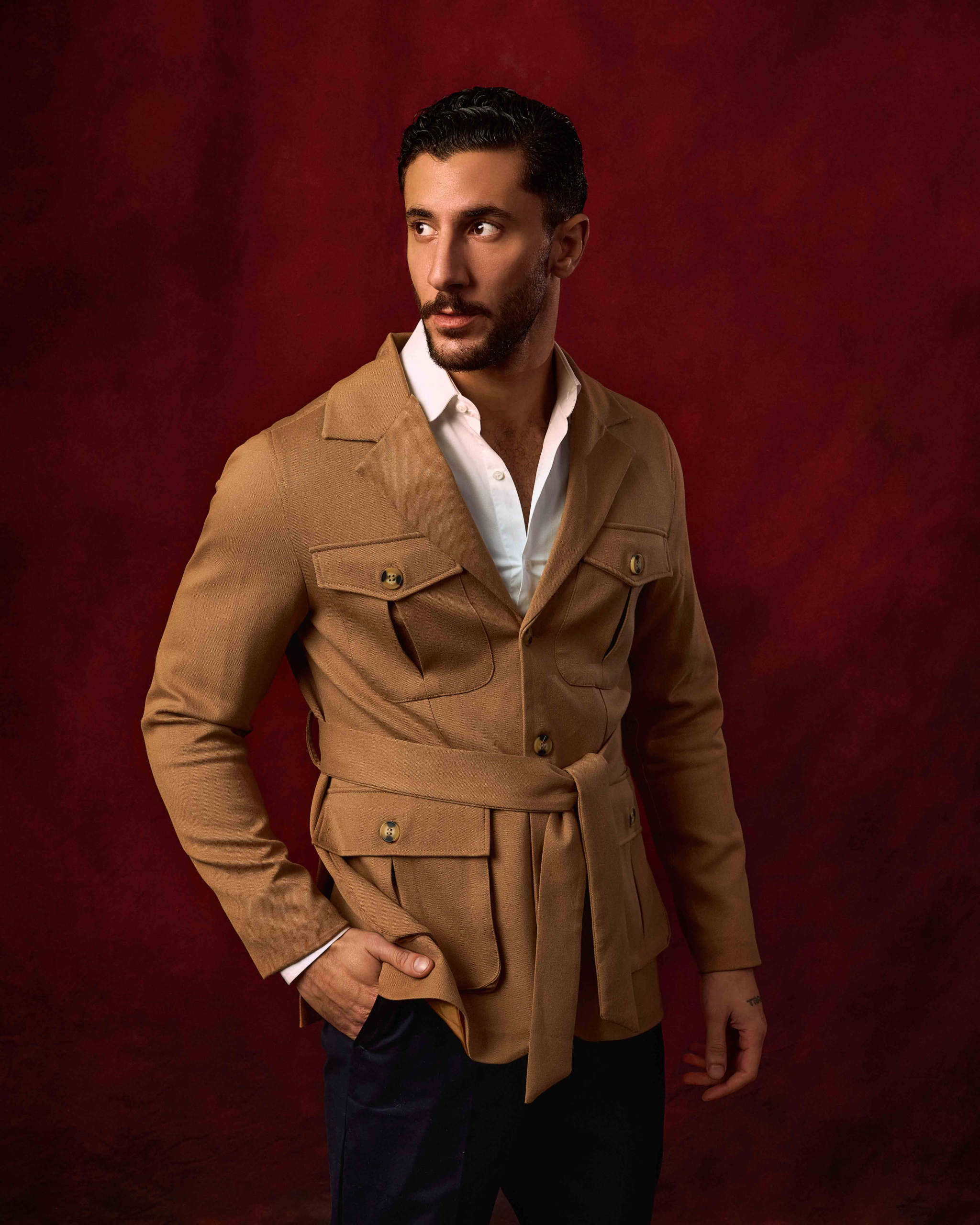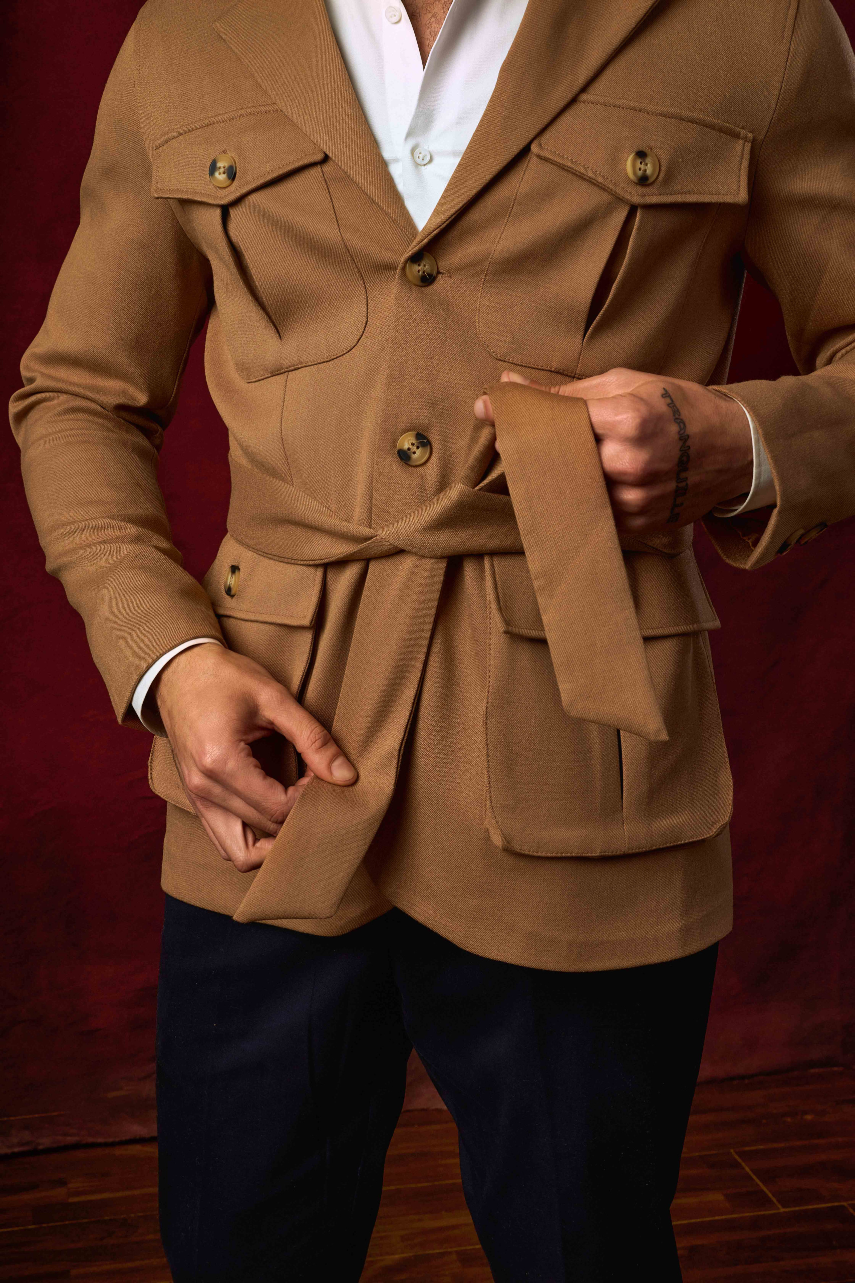 Brown Cotton-blend twill safari Jacket comes with four buttoned cargo pockets and a coordinating belt that can be used to cinch the waist.