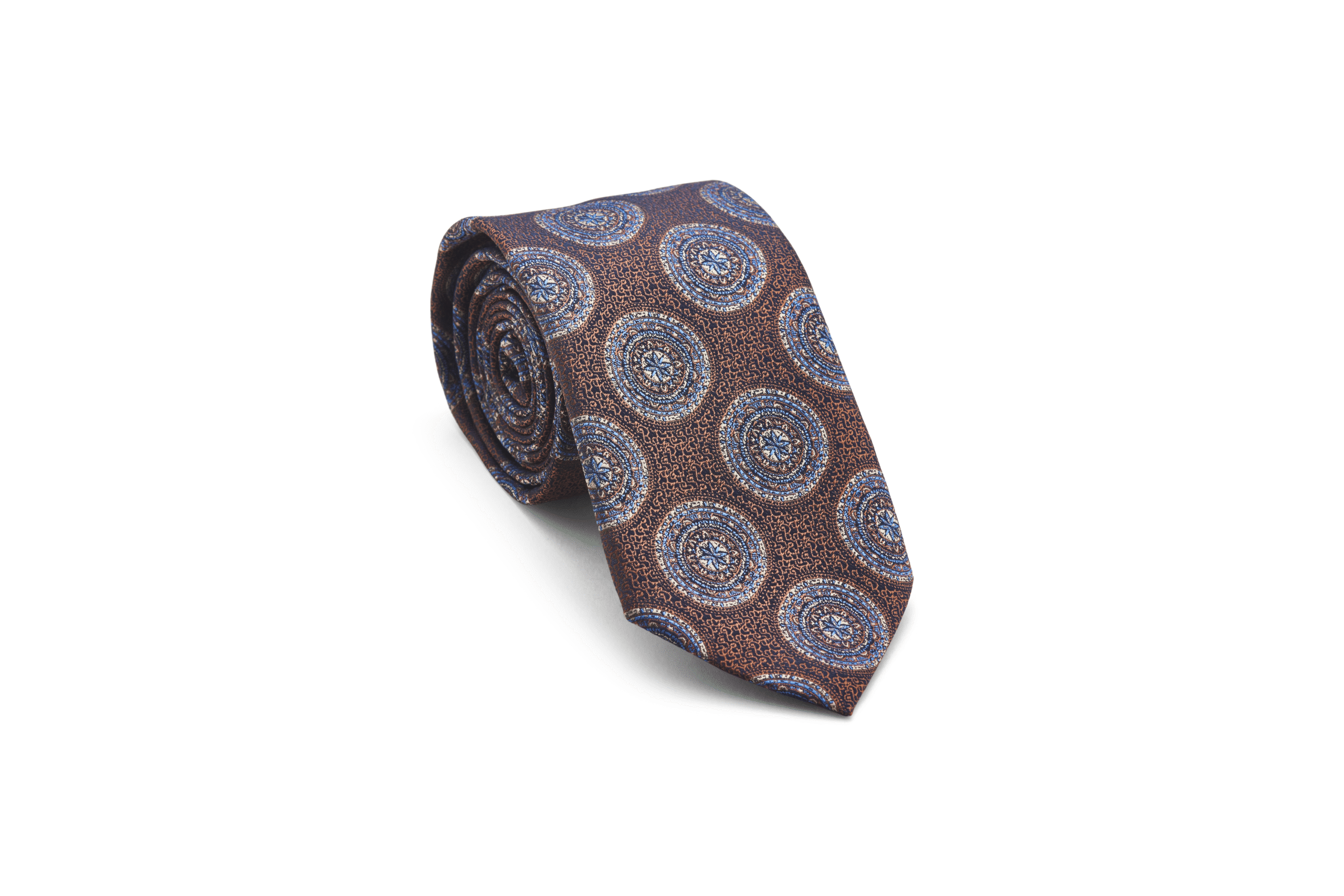 100% Jacquard Silk, 7.5 x 150 cm, Light Brown base, Blue-White, Trendy, Chic Pattern.