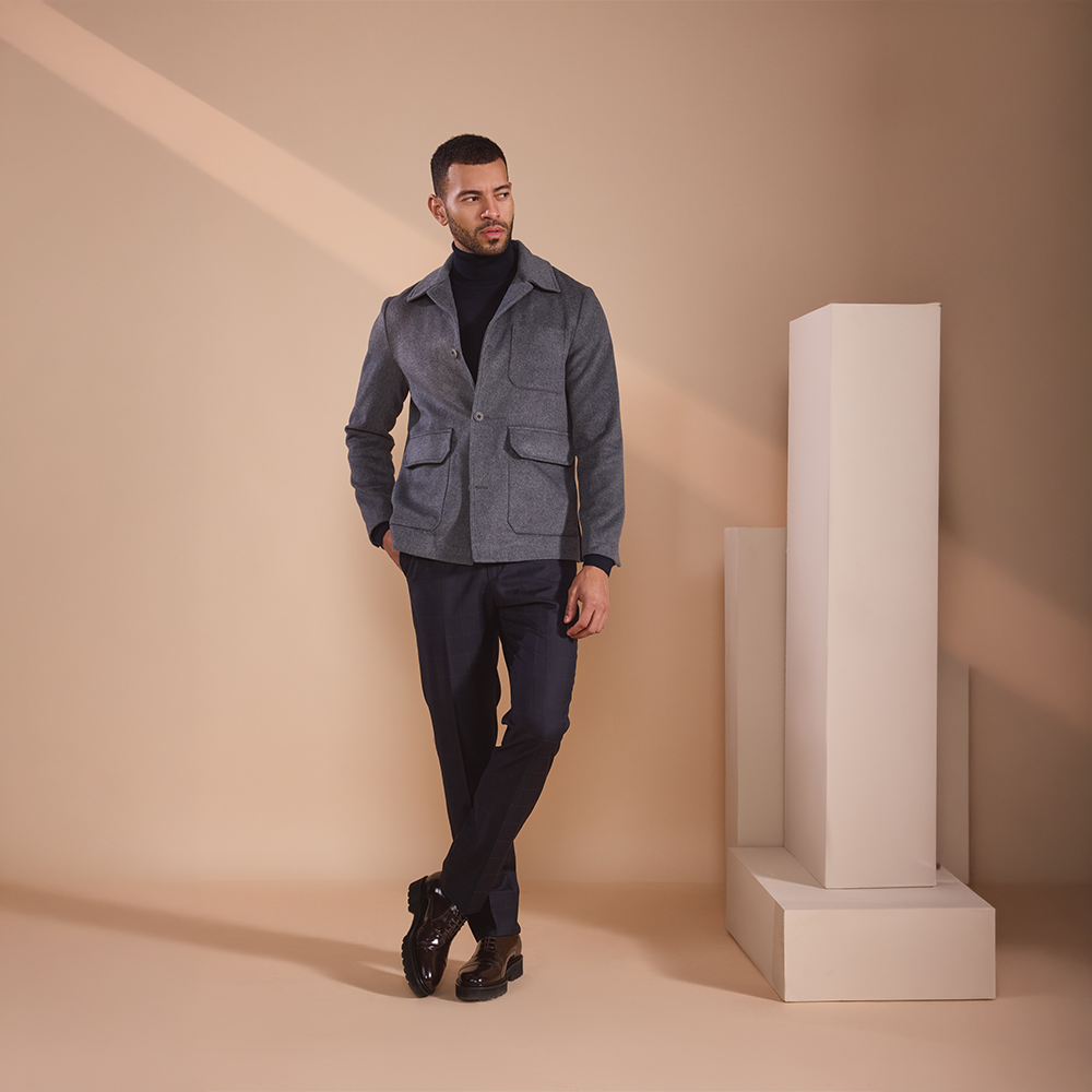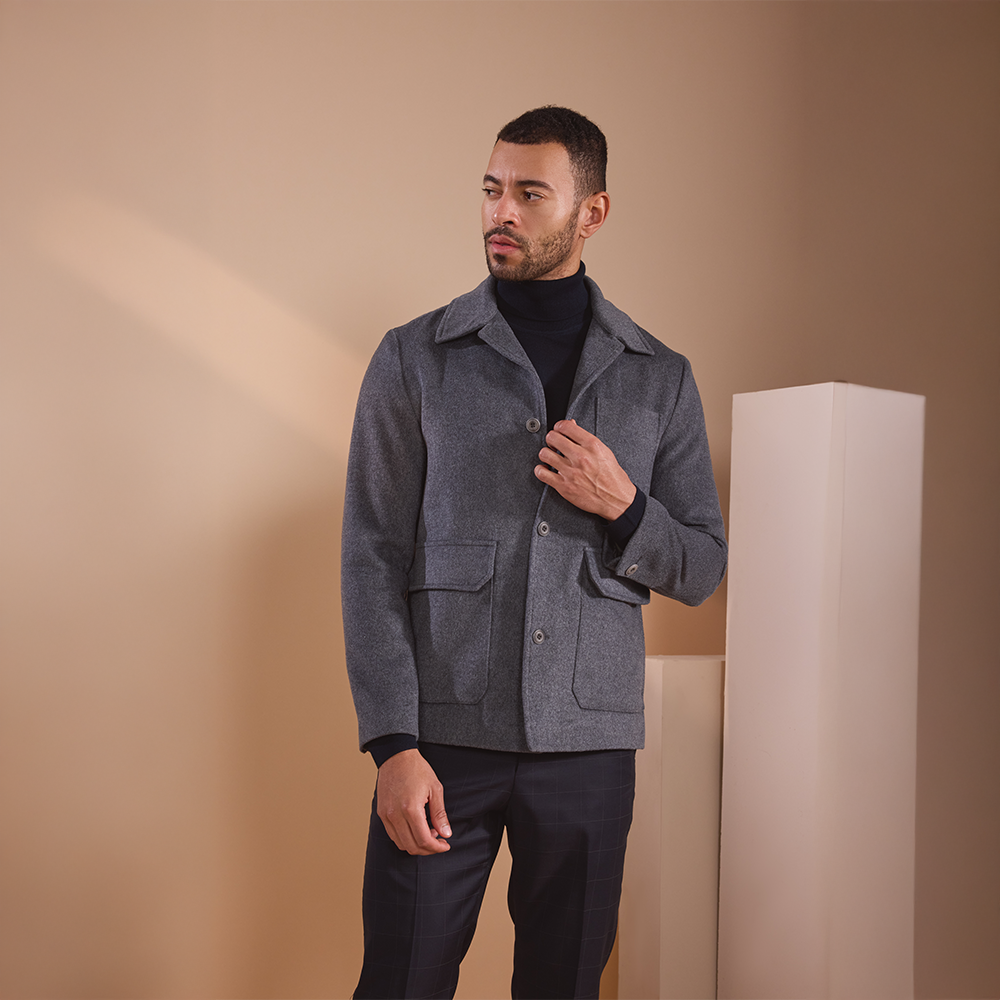 A timeless gray jacket with structured tailoring and utility pockets, delivering effortless sophistication and refined style.